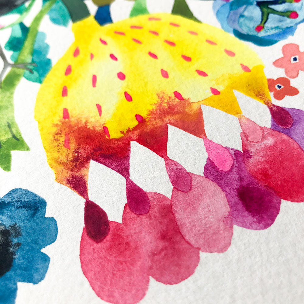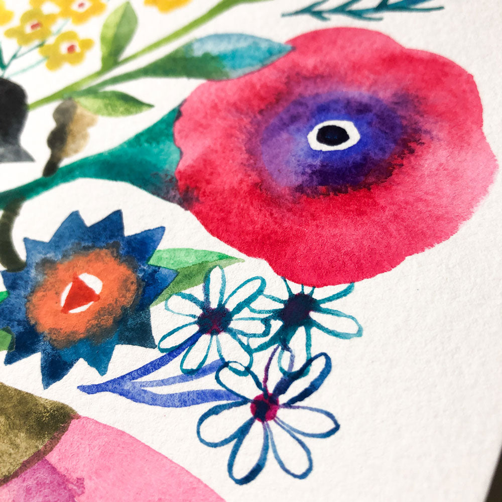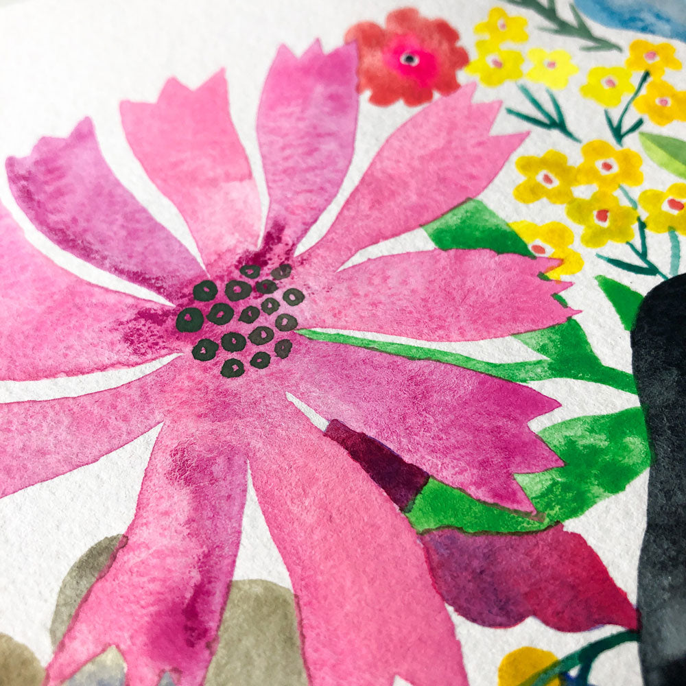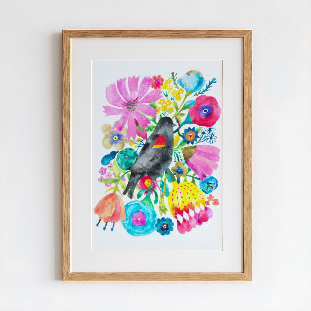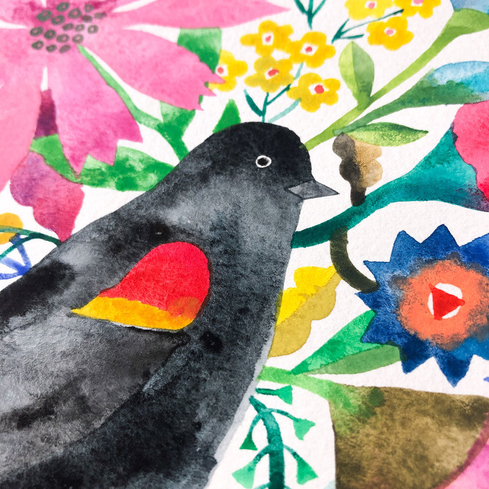 - One of a kind original watercolor & gouache (opaque watercolor) painting of a redwing blackbird surrounded by vibrant flowers on thick watercolor paper