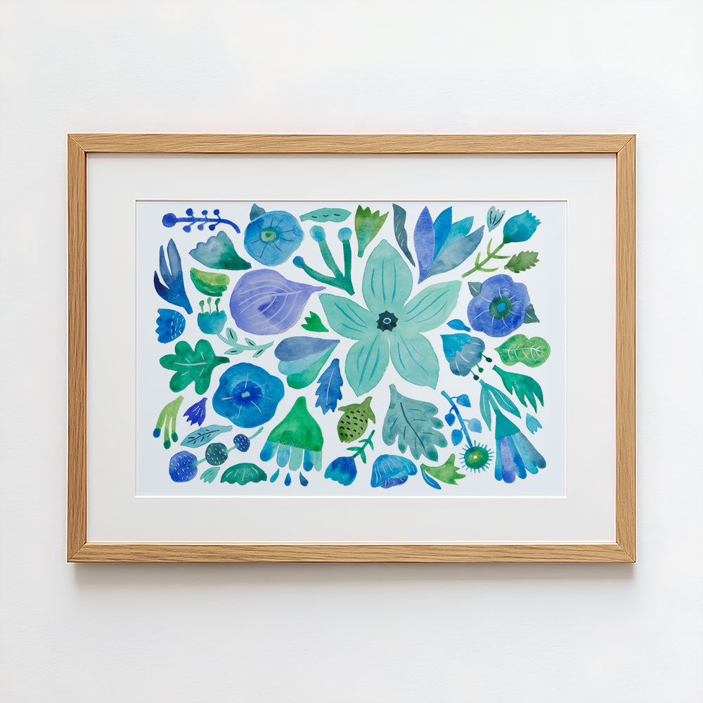 - One of a kind original watercolor & gouache (opaque watercolor) painting of blue and green flowers on thick watercolor paper.