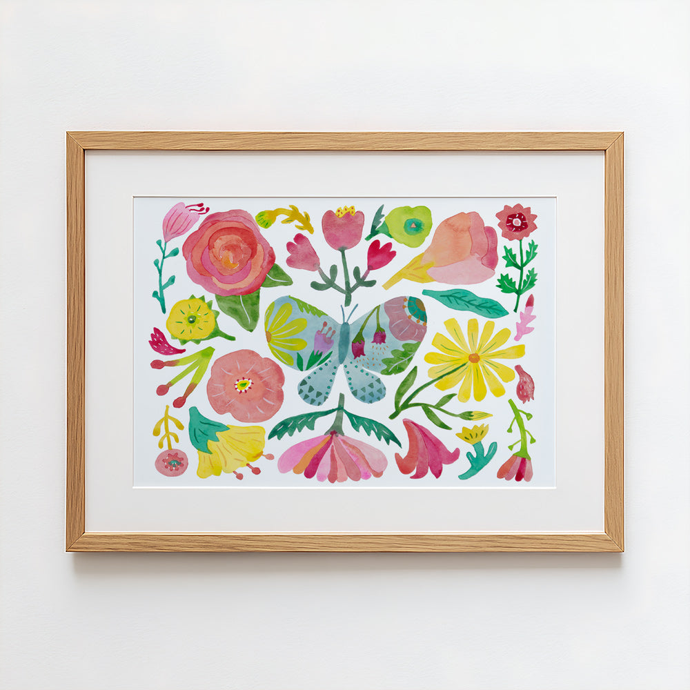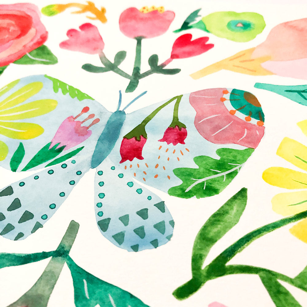 - One of a kind original watercolor & gouache (opaque watercolor) painting of a butterfly surrounded by vibrant flowers on thick watercolor paper.