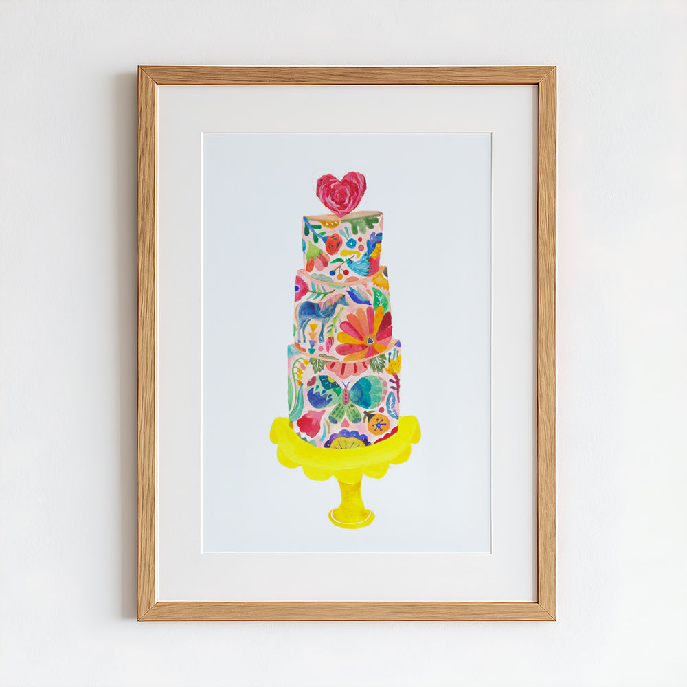 - One of a kind original watercolor & gouache (opaque watercolor) painting of a layered cake with colorful flowers and nature motif painted on on thick watercolor paper.