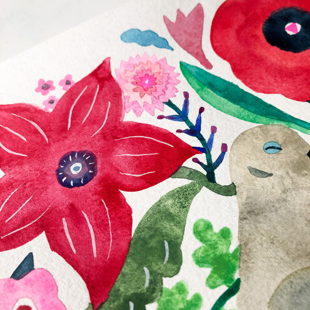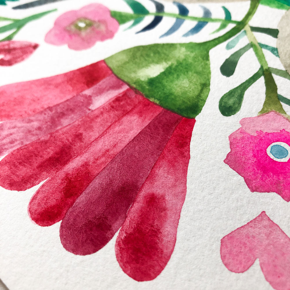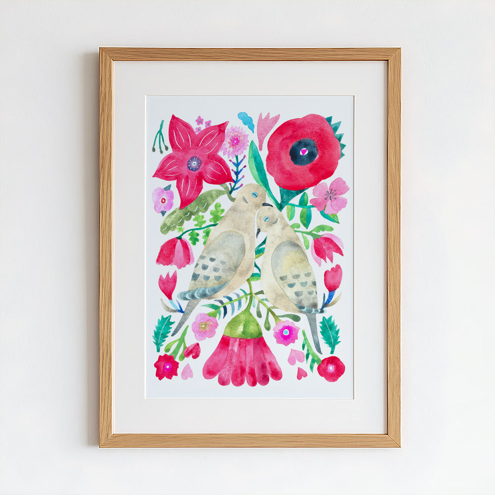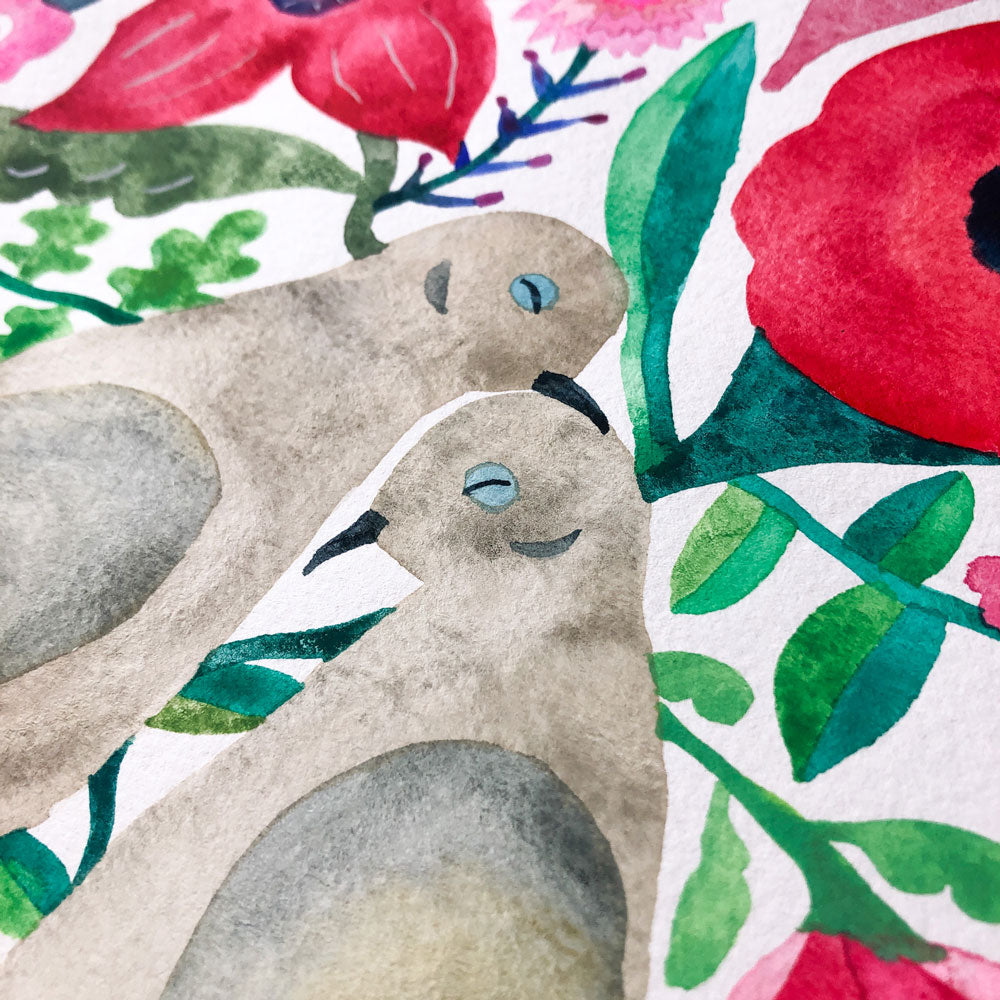 - One of a kind original watercolor & gouache (opaque watercolor) painting of two mourning dove snuggling with each other, surrounded by vibrant flowers on thick watercolor paper
