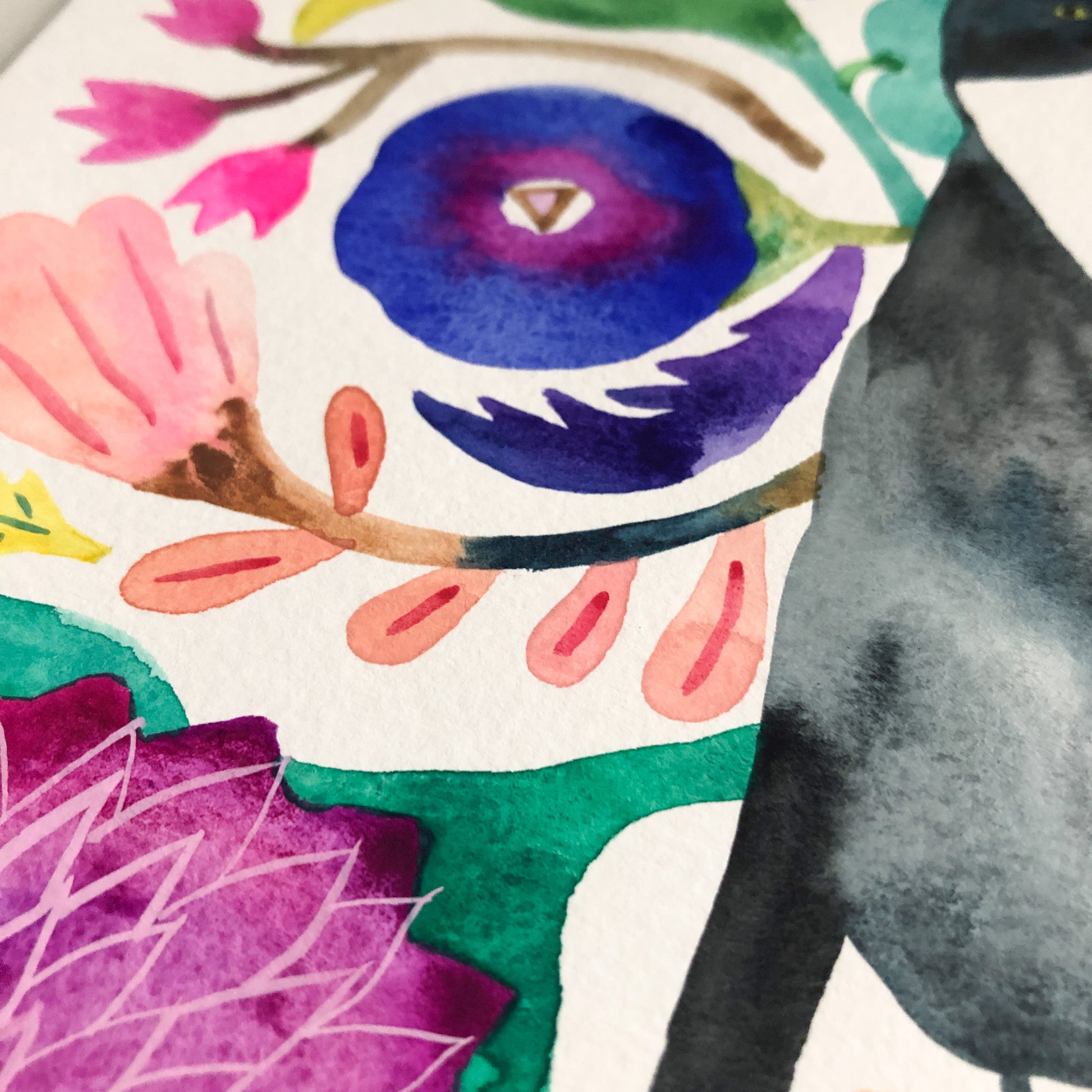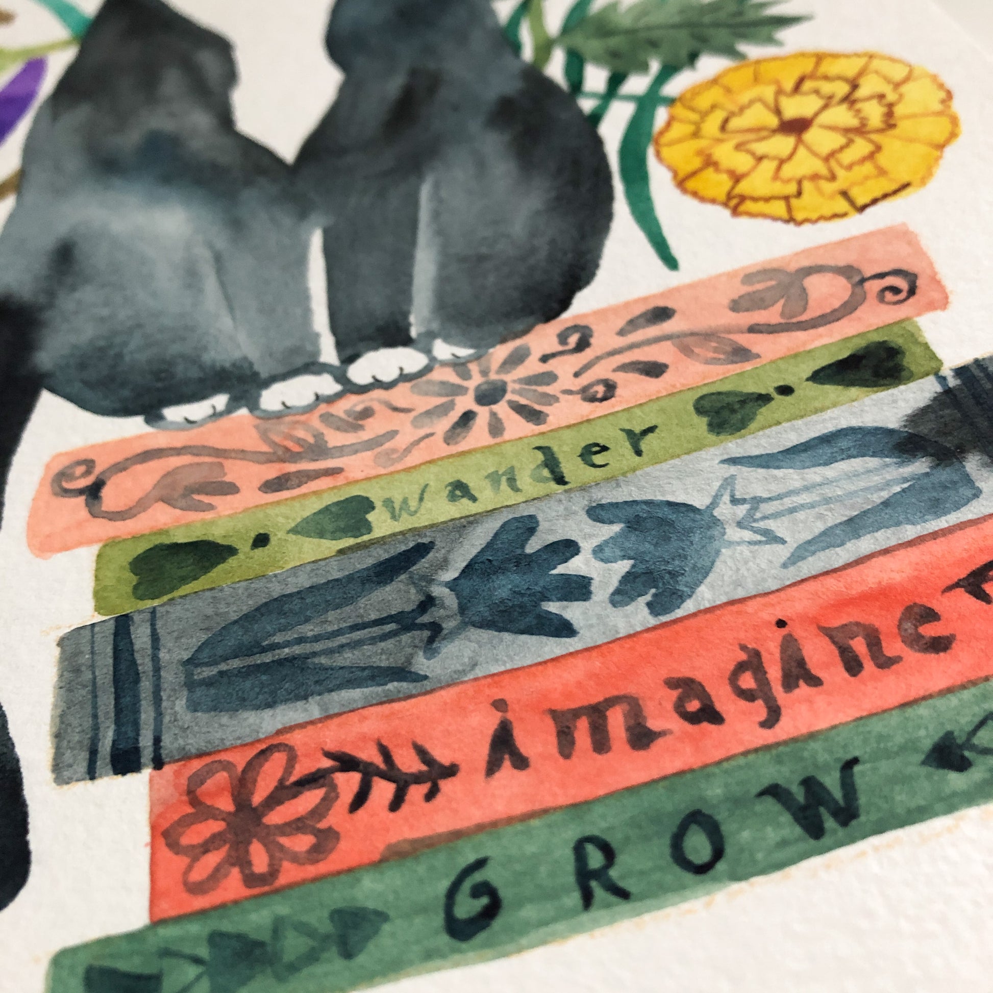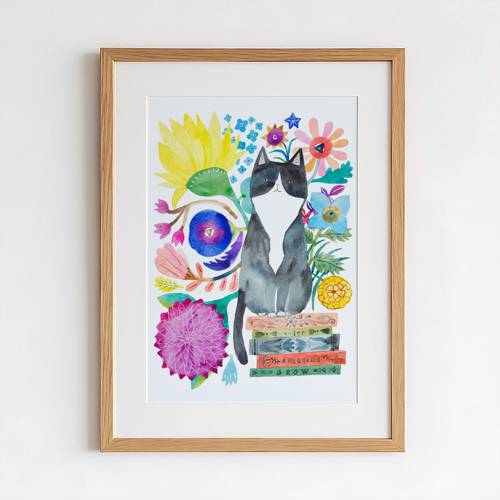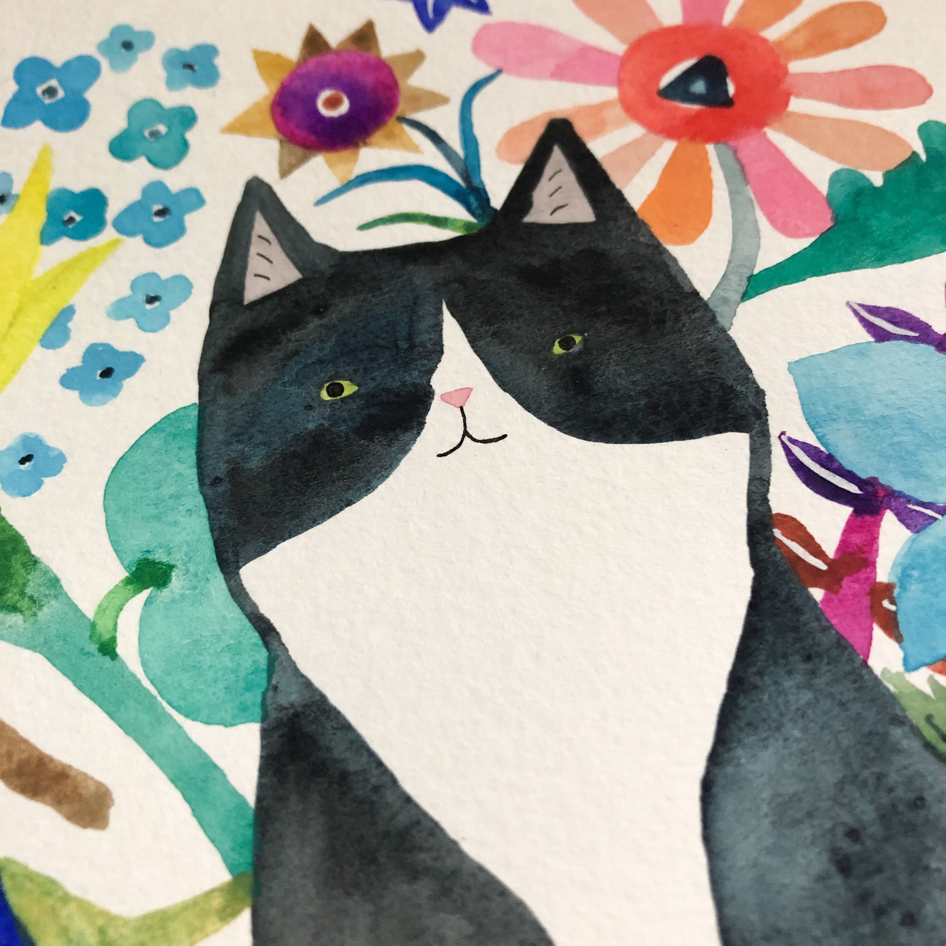 - One of a kind original watercolor & gouache (opaque watercolor) painting of a tuxedo cat sitting on a pile of books surrounded by vibrant flowers on thick watercolor paper