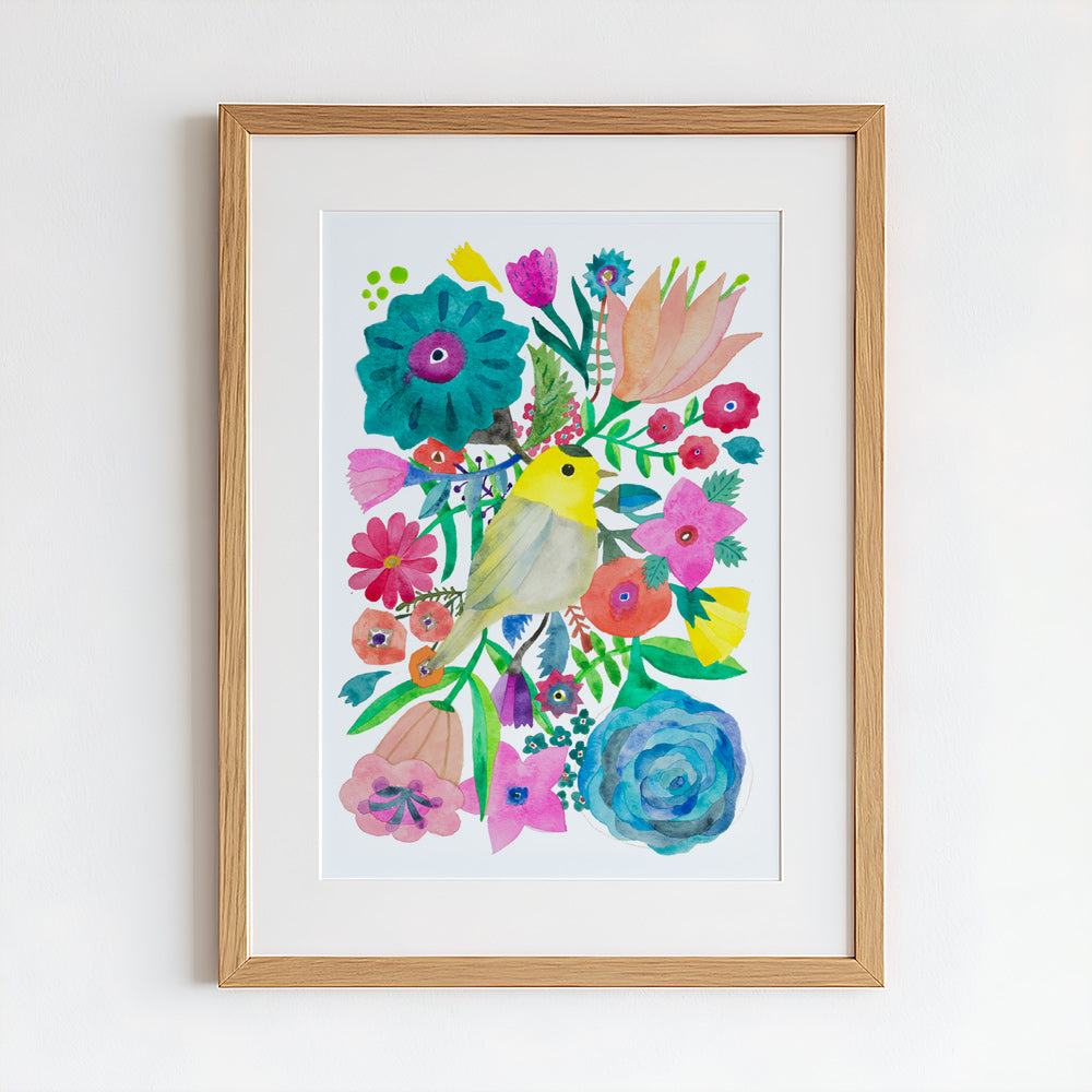 - One of a kind original watercolor & gouache (opaque watercolor) painting of a wilson's warbler surrounded by vibrant flowers on thick watercolor paper