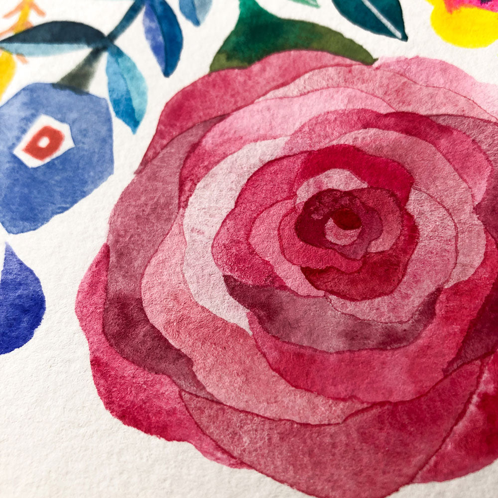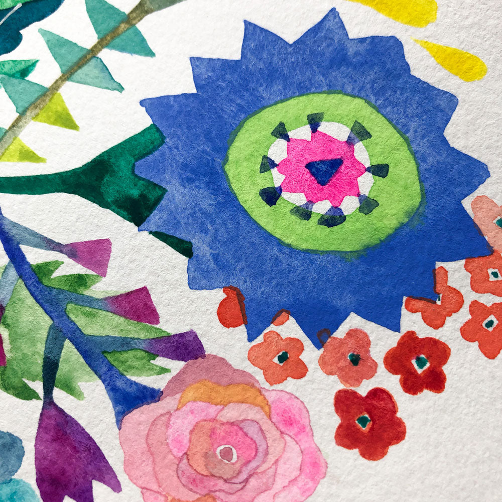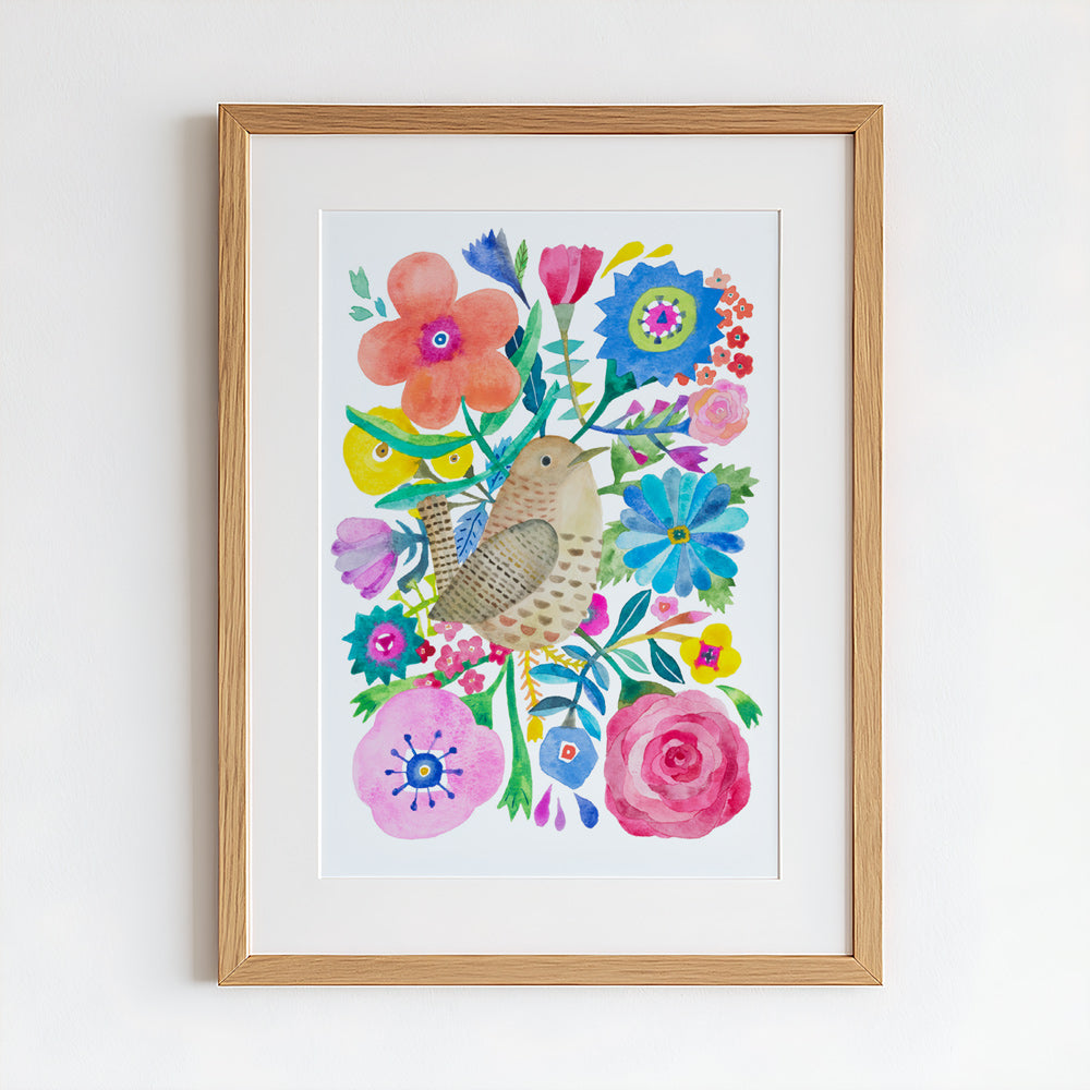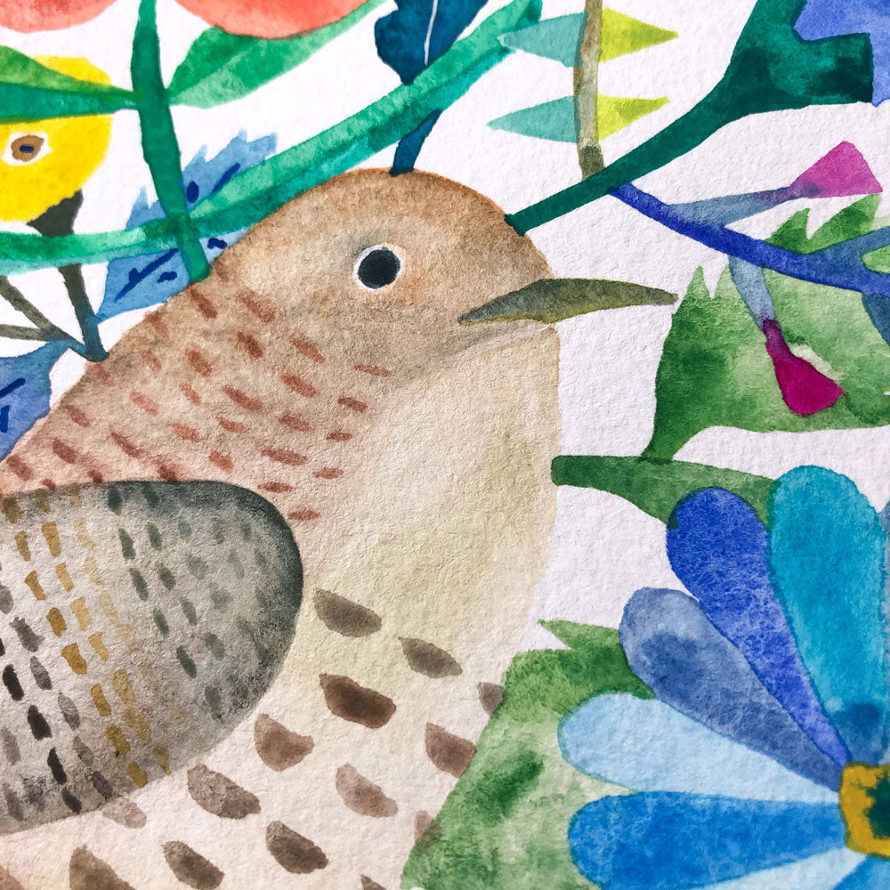 - One of a kind original watercolor & gouache (opaque watercolor) painting of a wren surrounded by vibrant flowers on thick watercolor paper